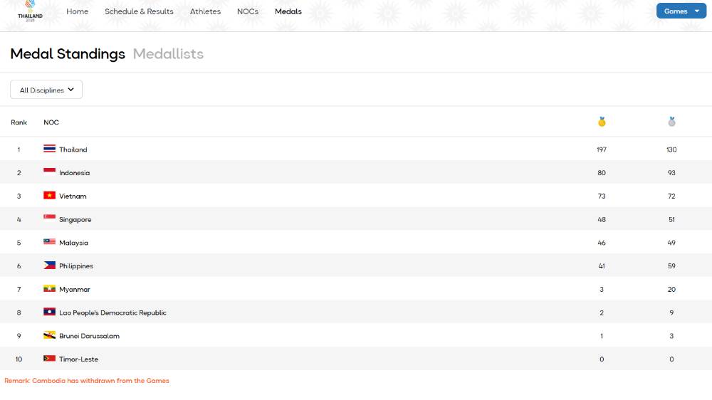 Posisi Indonesia berada tepat di bawah tuan rumah Thailand yang memimpin klasemen dengan raihan 197 medali emas dan total 420 medali. Meski selisih emas masih cukup lebar, Indonesia menunjukkan konsistensi prestasi dengan tetap unggul atas Vietnam yang berada di peringkat ketiga dengan total 244 medali.