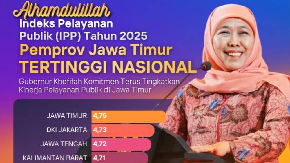 “Alhamdulillah, berdasarkan penetapan Kementerian PANRB, Jawa Timur dinyatakan sebagai provinsi dengan kinerja pelayanan publik terbaik tahun 2025. Ini bukan sekadar prestasi, tetapi amanah untuk terus menjaga dan meningkatkan kualitas pelayanan kepada masyarakat,” ujar Khofifah di Surabaya, Senin (12/1).