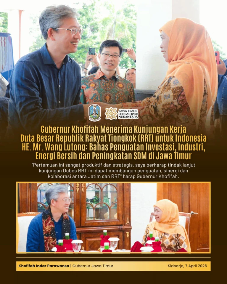 LITERASIKU.ID – SIDOARJO, 8 APRIL 2026 – Gubernur Jawa Timur Khofifah Indar Parawansa membahas penguatan kerja sama strategis di berbagai sektor, mulai dari investasi, industri, energi terbarukan, hingga pengembangan sumber daya manusia (SDM) saat menerima kunjungan kerja Duta Besar Republik Rakyat Tiongkok (RRT) untuk Indonesia HE. Mr. Wang Lutong di Gedung VIP Bandara Juanda, Sidoarjo, pada Selasa (7/4).