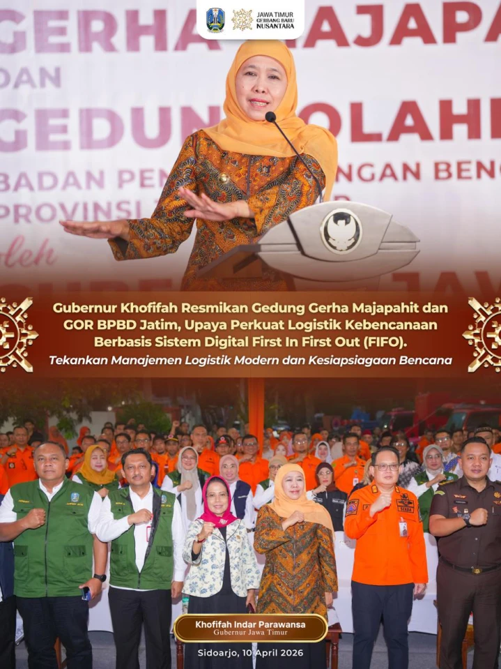 LITERASIKU.ID – SIDOARJO, 10 April 2026 – Gubernur Jawa Timur Khofifah Indar Parawansa meresmikan Gedung Gerha Majapahit dan Gedung Olahraga Badan Penanggulangan Bencana Daerah (BPBD) Provinsi Jawa Timur di Kantor BPBD Jatim, Kabupaten Sidoarjo, Kamis (9/4).