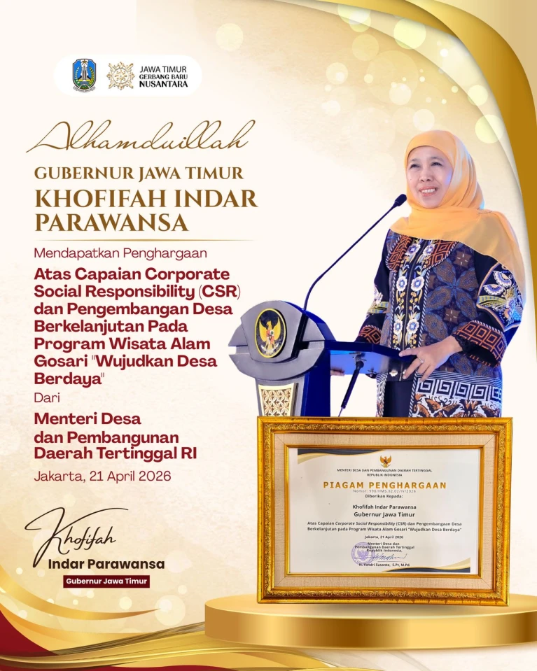 LITERASIKU.ID – Surabaya, 24 April 2026 – Gubernur Jawa Timur Khofifah Indar Parawansa menerima penghargaan Corporate Social Responsibility (CSR) dan Pengembangan Desa Berkelanjutan (PDB) Award 2026 dari Kementerian Desa dan Pembangunan Daerah Tertinggal. Penghargaan ini diraih melalui keberhasilan Program Wisata Alam Gosari bertajuk “Wujudkan Desa Berdaya”.