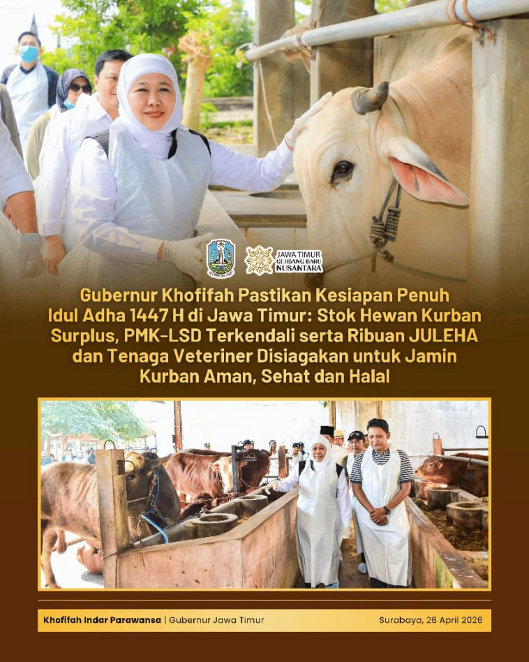 LITERASIKU.ID – SURABAYA, 27 APRIL 2026 – Gubernur Jawa Timur Khofifah Indar Parawansa memastikan kesiapan penuh pelaksanaan pemotongan hewan kurban pada Hari Raya Idul Adha 1447 H/2026 M di seluruh wilayah Jawa Timur.