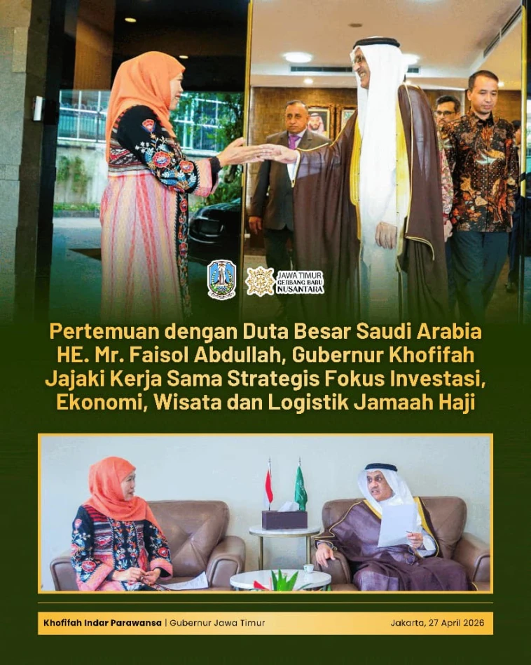 LITERASIKU.ID – JAKARTA, 28 April 2026 – Gubernur Jawa Timur Khofifah Indar Parawansa menjajaki peluang kerja sama strategis dengan Pemerintah Kerajaan Arab Saudi dalam berbagai sektor, mulai dari investasi, ekonomi, pariwisata hingga logistik jamaah haji.